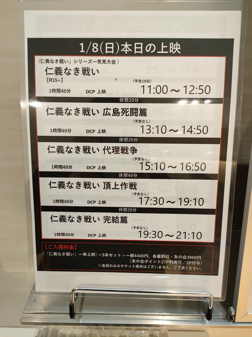 突然ですが、昨日池袋の新文芸坐で『仁義なき戦い』5部作一気見大会があったので気合を入れて観てきました。結構、新文芸坐では毎年恒例のように『仁義~』の一挙上映をやってるみたいです(今年は1/18の一日のみ)。それで、午前11時スタートでラストは午後9時10分に終わることは映画館の公式のスケジュールで分かったのですが、間の休憩時間など細かいタイムテーブルや長期戦への備えのことなど、ネットで調べてもあまりヒットしなかったので、来年以降も実施された場合観る人のための心構えになるかもと思い、感想も交えてリポートを書いてみます。